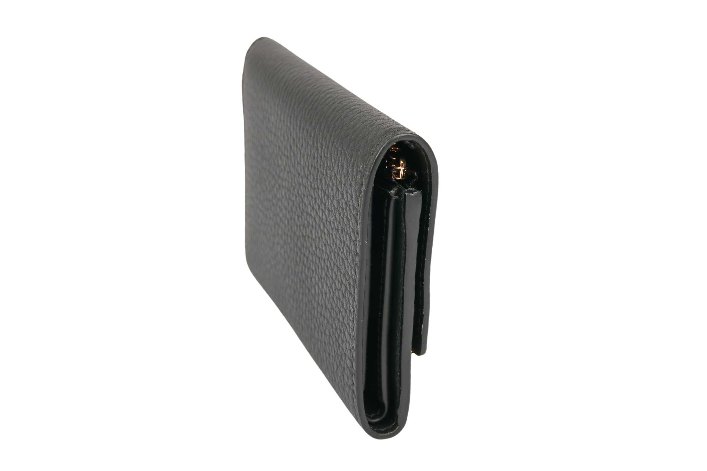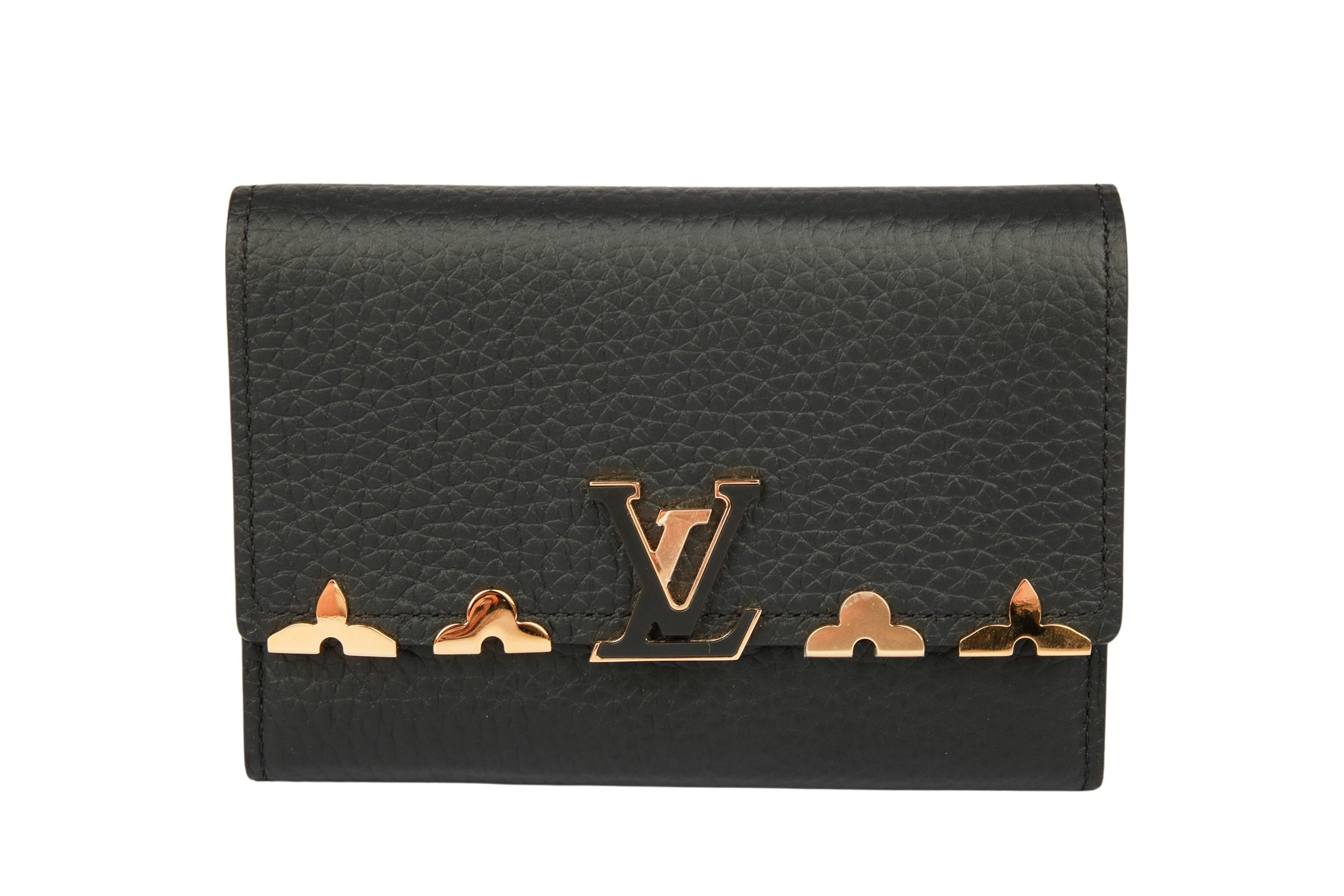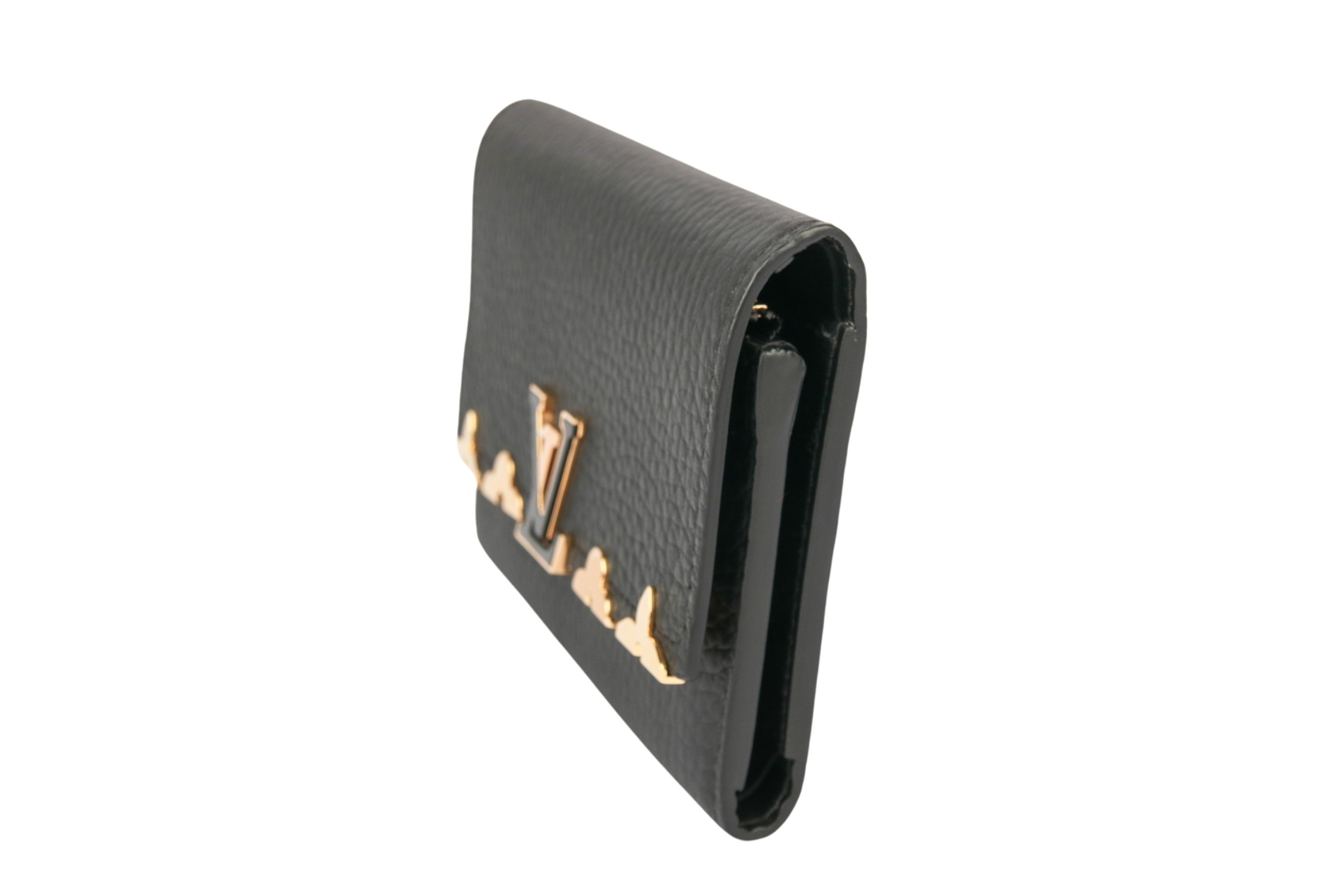 Die Louis Vuitton Compact Capucines Geldbörse in Schwarz ist eine elegante und kompakte Geldbörse, gefertigt aus luxuriösem, schwarzem Taurillon-Leder. Das ikonische LV-Metalllogo und die raffinierte Verarbeitung verleihen ihr eine edle Ausstrahlung. Trotz ihrer kompakten Größe bietet die Geldbörse genügend Platz für Karten, Scheine und Münzen. Ein stilvolles Accessoire, das zeitlose Eleganz mit Funktionalität verbindet.