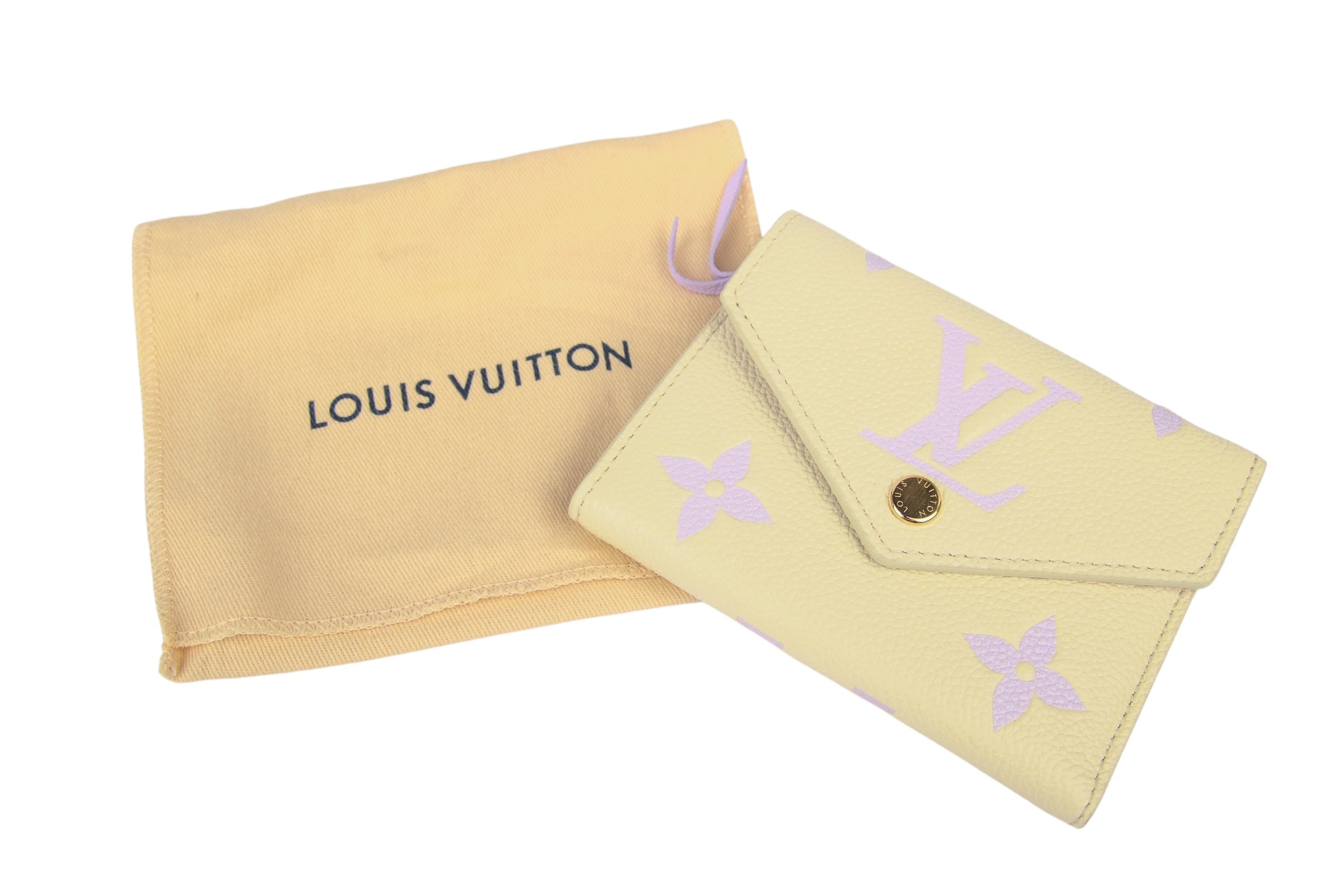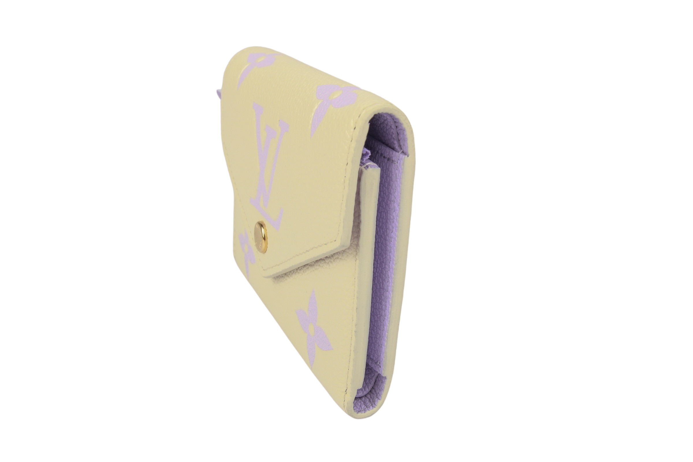 Die Louis Vuitton Victorine Geldbörse in Monogram Offwhite/Flieder ist eine kompakte, stilvolle Geldbörse mit dem ikonischen Monogramm-Muster. Die Kombination aus beigem und fliederfarbenem Leder verleiht ihr einen eleganten, femininen Touch. Mit mehreren Fächern für Karten, Geldscheine und Münzen bietet sie praktische Organisation im handlichen Format. Ein luxuriöses Accessoire für den Alltag, das zeitlose Eleganz und Funktionalität verbindet.